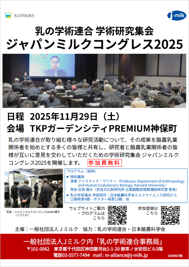 一般社団法人Jミルクと乳の学術連合は、11月29日(土)にTKPガーデンシティPREMIUM神保町において、学術研究集会「ジャパンミルクコングレス2025」を開催します。